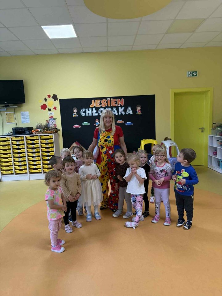 Na zakończenie wydarzenia wszystkie dzieci odwiedził wyjątkowy gość – klaun, w którego wcieliła się Pani Iwonka z grupy Zielone Jabłuszka. Jej barwne przebranie, żarty i wesołe zabawy sprawiły, że ten dzień na długo pozostanie w pamięci przedszkolaków. 🤡🎈